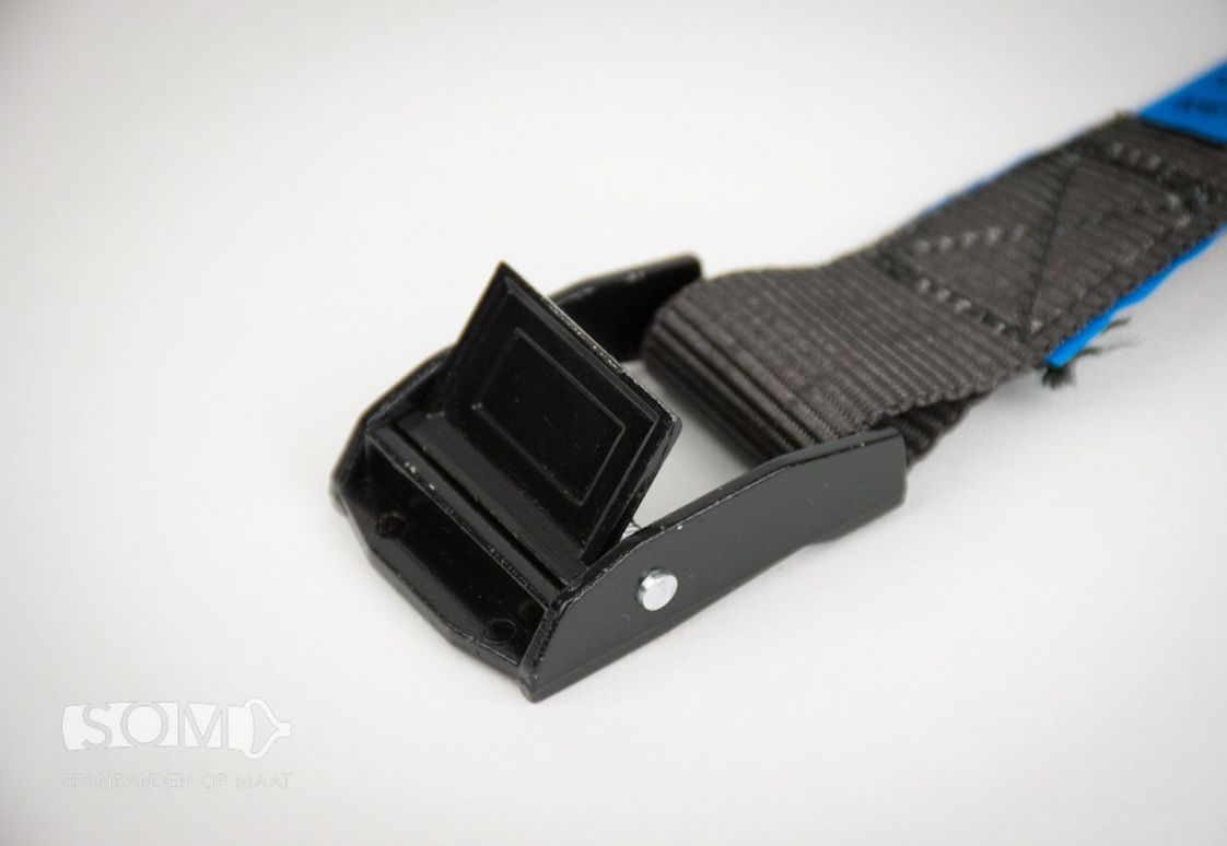 De sjorband is samengesteld uit hoogwaardig geweven polyester (PES) en is voorzien van een dubbelgeveerde zwarte klemgesp. Dit product voldoet aan alle wet- en regelgeving omtrent ladingzekering, zoals de EN12195-2 normering.