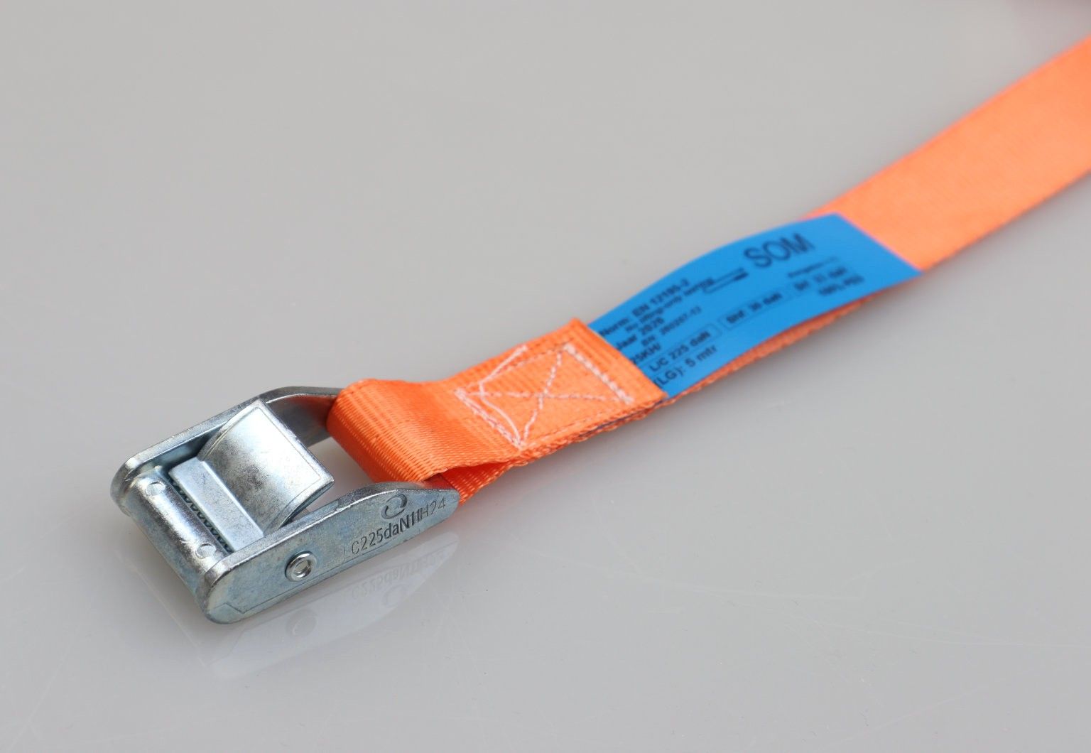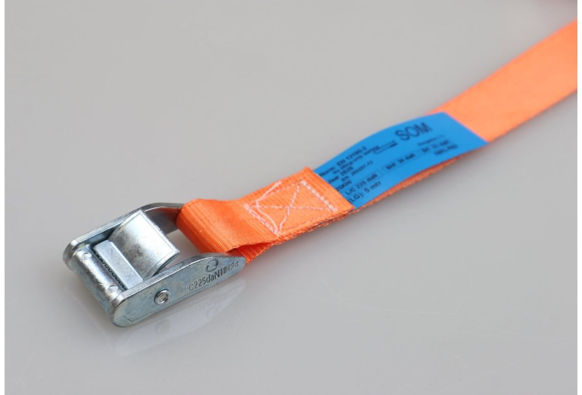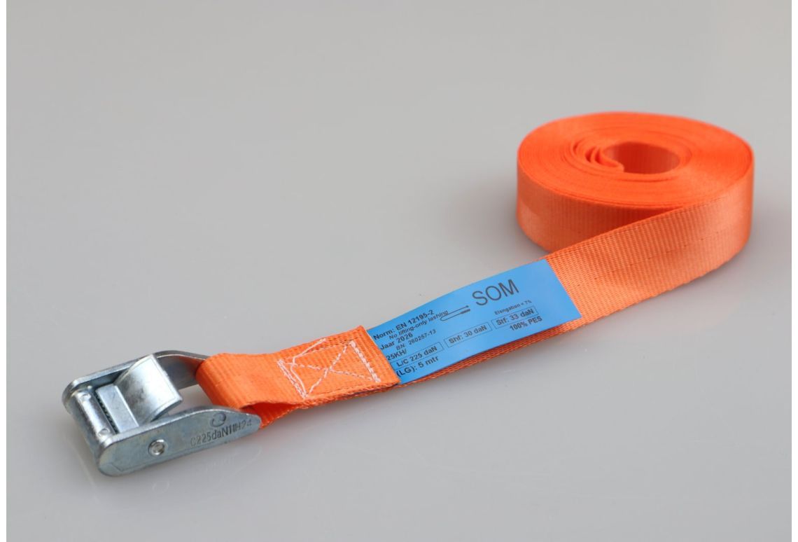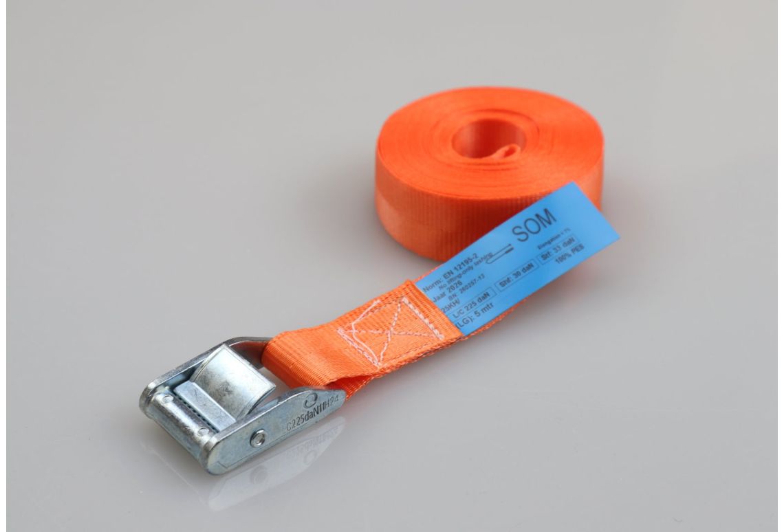 De sjorband is samengesteld uit hoogwaardig geweven polyester (PES) en is voorzien van een dubbelgeveerde klemgesp van verzinkt staal. Dit product voldoet aan alle wet- en regelgeving omtrent ladingzekering, zoals de EN12195-2 normering.