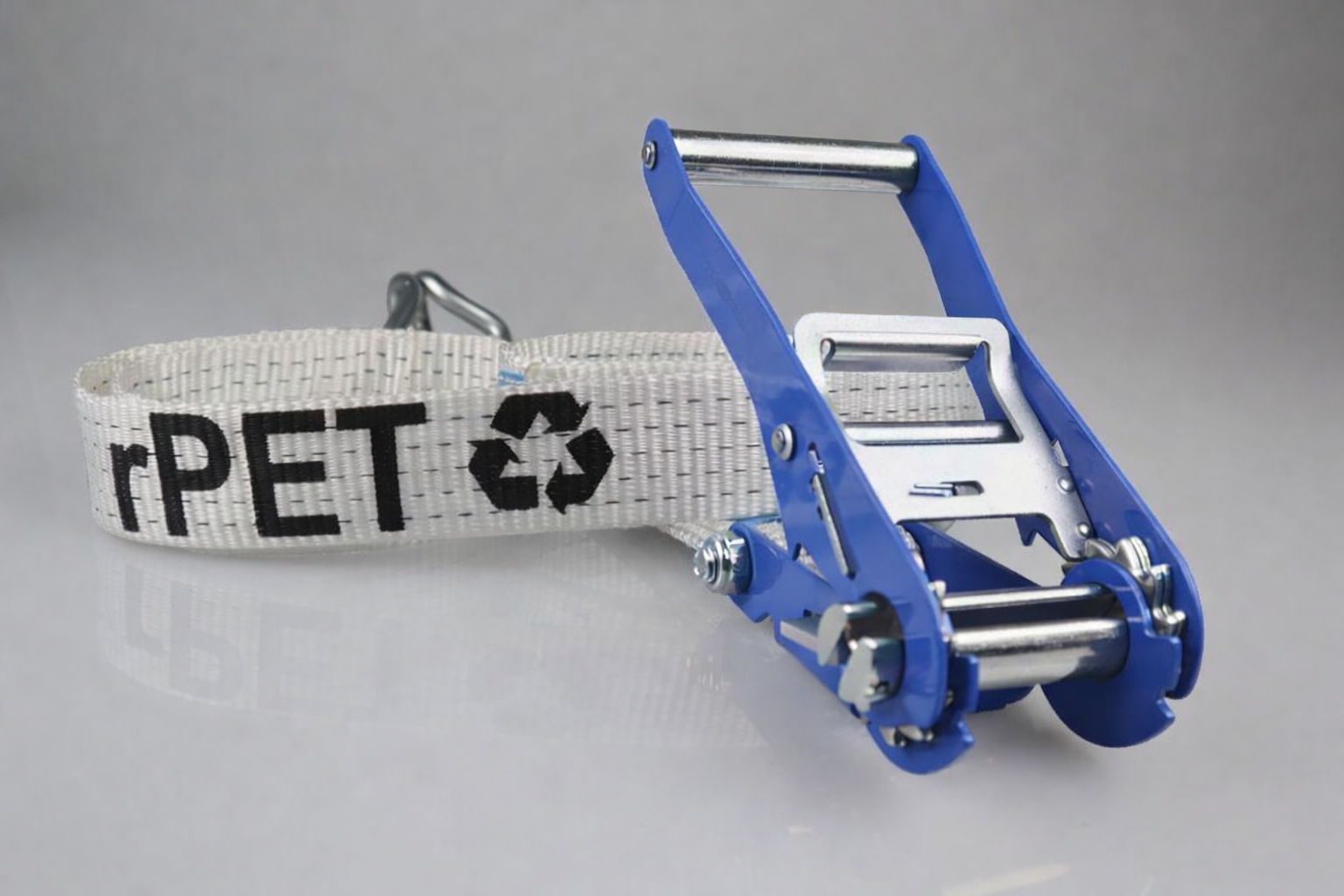 Deze spanband is samengesteld uit gerecycled geweven polyester (rPET) en voldoet aan alle wet- en regelgeving omtrent ladingzekering, zoals de EN12195-2 normering. Om de spanband zo duurzaam mogelijk te houden, is deze alleen leverbaar in de kleur wit. Het kleuren van de banden is namelijk een extra bewerking die invloed heeft op het milieu. Daarnaast zijn de spanbanden voorzien van een ingenaaid label, zodat deze niet snel beschadigd raakt. De hardware is voorzien van een zinklaag (Chroom 6 vrij) om corrosie tegen te gaan.